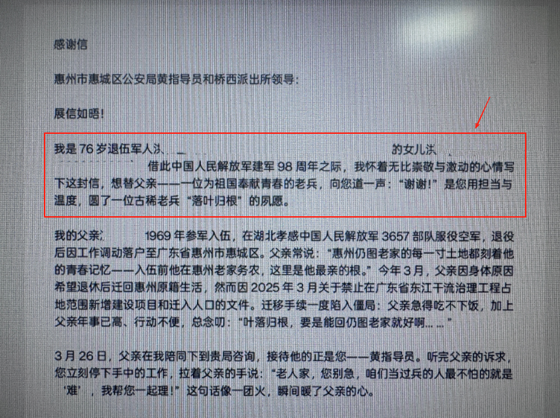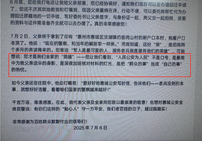 “黄指导员像亲人一样跑前跑后,让我想起部队里的战友。”病榻上的洪先生反复叮嘱女儿致谢。这封手写感谢信,不仅记录了一位老兵对故土的眷恋,更见证了惠城公安以“民生无小事”的担当。
