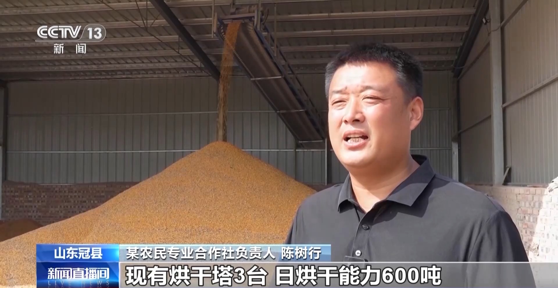 冠县某农民专业合作社负责人 陈树行:现有烘干塔3台,日烘干能力600吨,由于最近连阴雨天气,农户的玉米棒无法储存,容易发芽、霉变。为了减轻农户的经济损失,我们合作社24小时不停连续烘干。