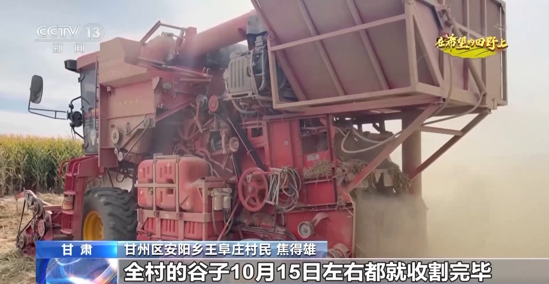 甘州区安阳乡王阜庄村民 焦得雄:全村种了1000多亩的谷子,基本上地里90%都能捡拾着脱掉,全村的谷子基本在10月15日收割完毕。
